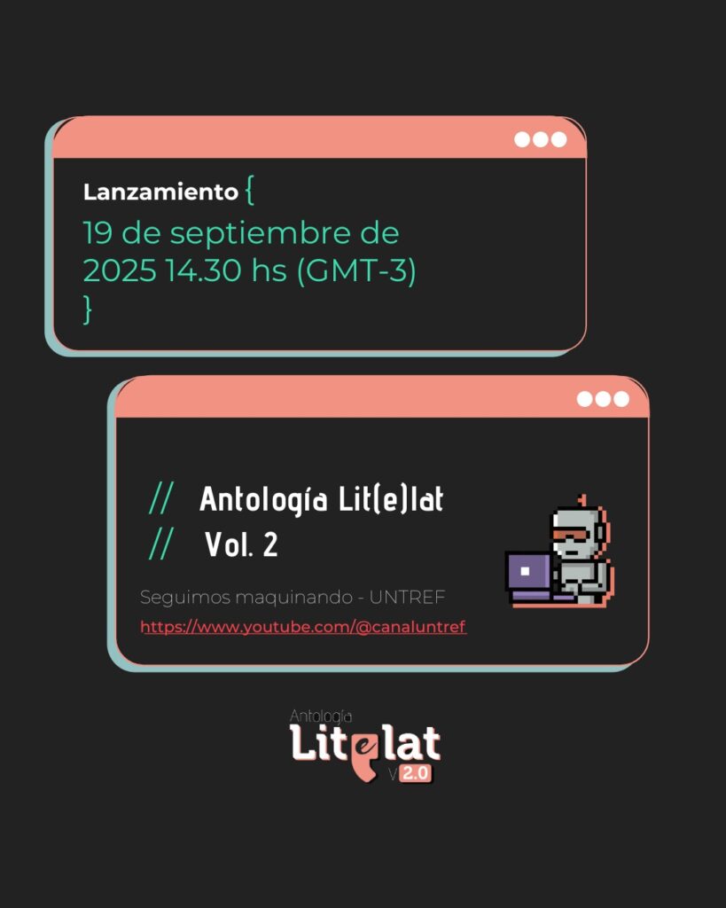 El viernes 19 de septiembre de 2025 se presentará la Antología Lit(E)Lat vol.2. en el evento que celebra los diez años de la Red Lit(E)Lat. Junto con el comité editor, nos referiremos a la convocatoria inicial, la selección, la diagramación y las decisiones que tomamos en cada etapa del proceso de armado de este volumen. El link para la inscripción a todas las actividades previstas del evento Seguimos Maquinando está disponible aquí.